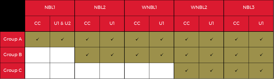 The table below shows the different competitions and what group you would need to be to officiate those competitions. Please note, you must be a Level 3 Referee to be placed into Group B and above.