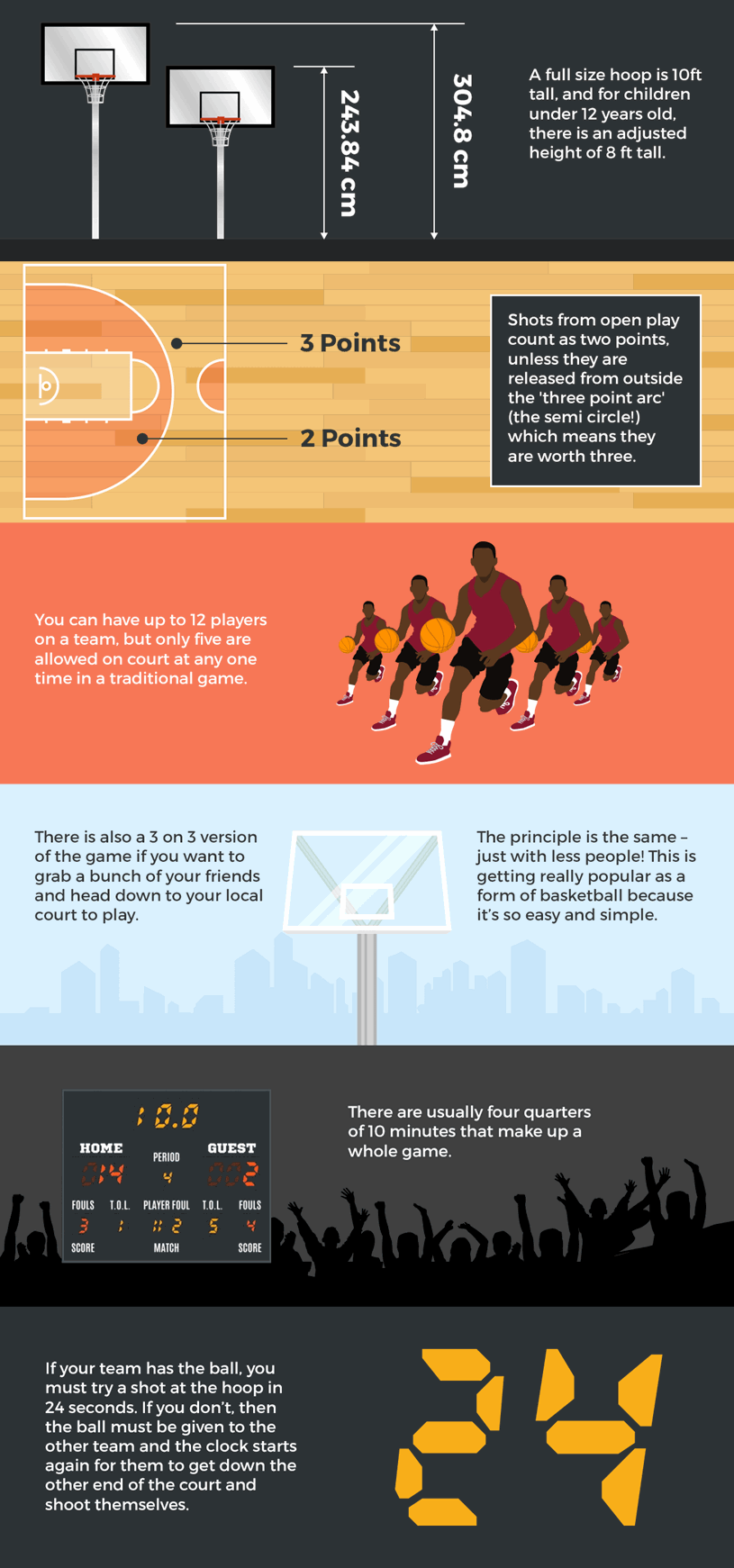 Naismith wrote the basic rules and then nailed a peach basket onto a 10-foot tall pole. Unlike modern basketball hoops, the bottom of the peach-basket was still there, so after a point was scored, somebody had to get the ball out of the basket with a long stick. Over time, people made a hole at the bottom of the basket, so the ball could go through more easily.