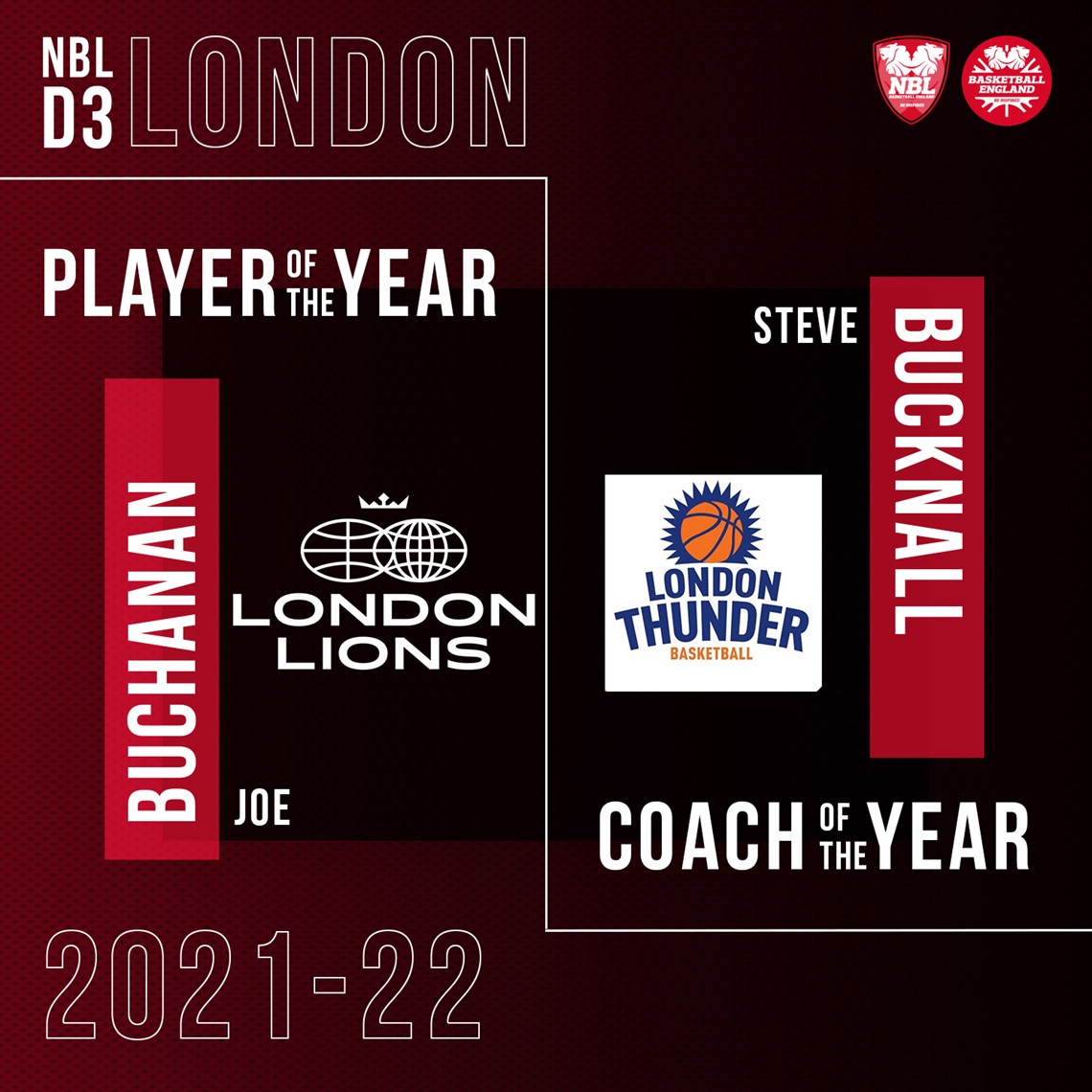 London Thunder's Steve Bucknall gets the nod as Coach of the Year, earning the accolade for guiding his side to a 9-3 season and top spot in the conference.