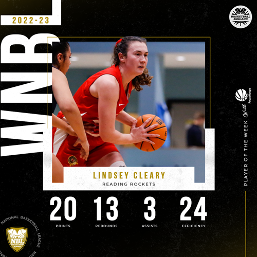 Cleary claimed my Player of the Week honours thanks to a 20-13 double-double in Reading’s 60-52 win over Loughborough Riders on Saturday.