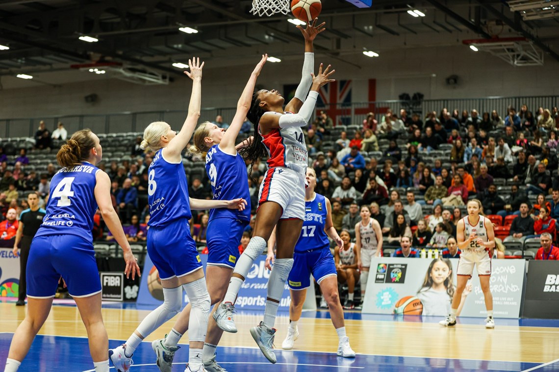 Temi Fagbenle led the scoring for GB with 23 points and seven rebounds with Holly Winterburn (12), Chantelle Handy (11), Shequila Joseph (10) and Hannah Robb (10) all in double figures as Coach Buceta gave all 12 of his players court-time. Kennedy Leonard dished out eight assists to go with her five points.