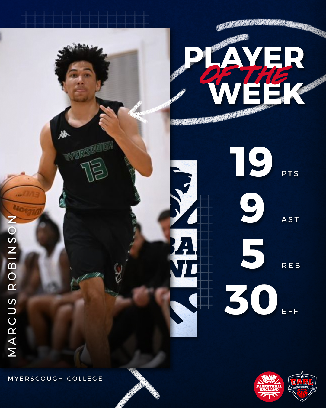With 19 points, nine assists and five rebounds as his Myerscough beat Manchester 92-83, he flirted with a double-double. Team-mate Harry Godwin (23pts) led all scorers for the hosts and winners in the North Conference clash, while Ronney Ani (32pts, 12reb, 5ast) and Jack Walton (13pts, 7ast, 4reb, 4stl) did good work for Magic.