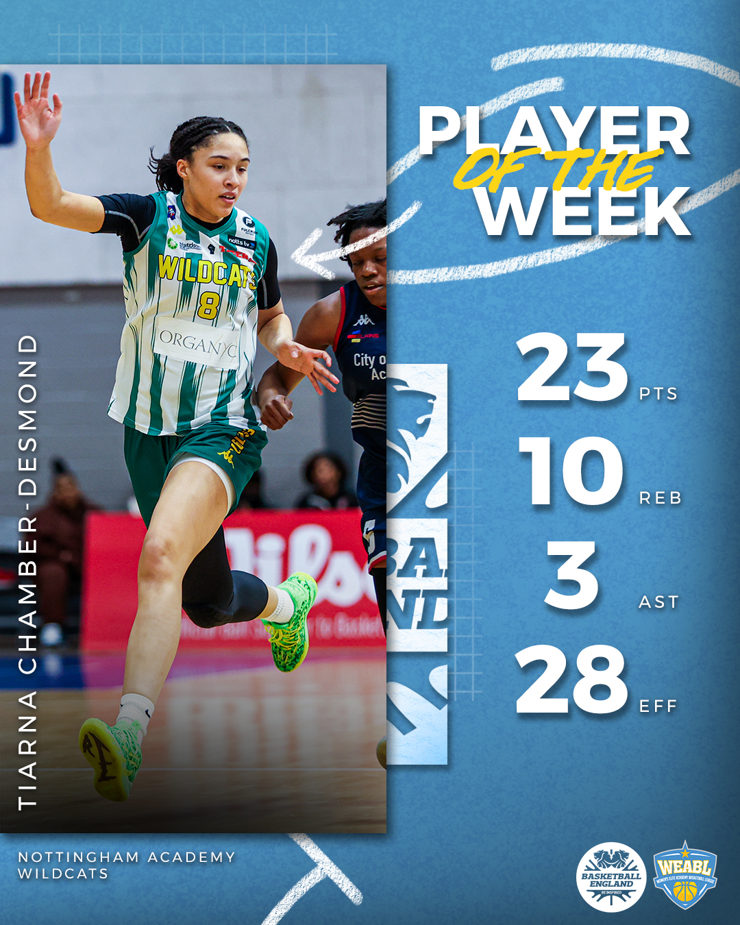 Tiarna Chamber-Desmond paired 23 points with 10 rebounds in Nottingham Academy Wildcats' statement 76-68 win over Charnwood College Riders.